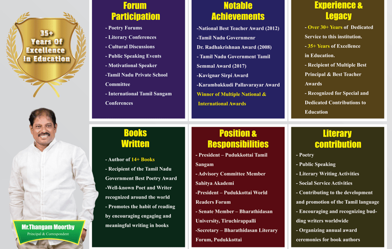 Under the visionary leadership of Mr. Thangam Moorthy, M.A., M.Ed., National Best Teacher Awardee, our institution continues to grow as a center of excellence where every child is guided with care and purpose.